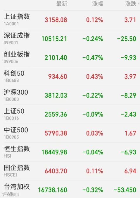 1、A股:A股震荡盘整,芯片产业链、军工股走强,地产股大涨。上证指数收涨0.12%,报3158.08点,深证成指跌0.24%,创业板指跌0.47%,北证50涨0.03%,科创50涨0.43%,上证50跌0.09%,万得全A涨0.11%,万得双创涨0.53%。A股成交额为7728亿元,北向资金净买入0.41亿元,中兴通讯获净买入3.18亿元居首,隆基绿能遭净卖出4.52亿元最多。
