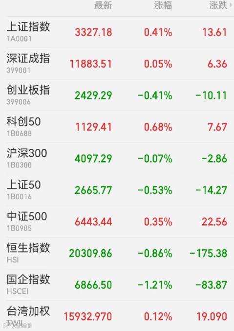 1、A股:A股全天走势分化,人工智能与中字头携手共进,大消费、新能源依旧低迷。截至收盘,上证指数涨0.41%报3327.18点,深证成指涨0.05%,创业板指跌0.41%,北证50跌0.53%,万得全A、万得双创分别涨0.3%、0.61%。A股全天成交1.13万亿元,连续7日位于万亿上方。北向资金净卖出42.08亿元,贵州茅台、扬杰科技、大华股份分别遭净卖出7.05亿元、5.54亿元、5.48亿元。