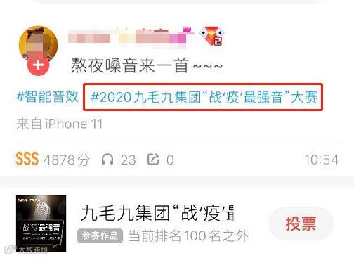 成功参加比赛的作品会出现文字:#2020九毛九集团“战‘疫’最强音”大赛。
