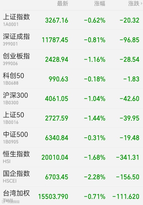 1、A股:A股震荡回调,上证指数收盘跌0.62%报3267.16点,深证成指跌0.81%,创业板指跌1.1%,万得全A、万得双创均跌超0.6%。A股全天仅成交7264.8亿元,创春节以来新低;北向资金净卖出50.97亿元,上周累计减仓逾40亿元,终结连续14周净买入态势,贵州茅台、隆基绿能分别遭净卖出7.07亿元、5.38亿元。本周指数层面出现明显分化,沪指周涨1.34%,深成指涨0.61%,创业板指则跌0.83%,周线4连涨后又连跌4周。