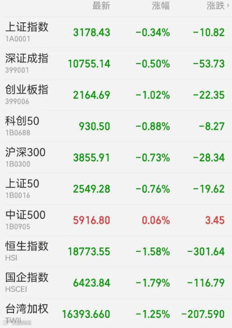 1、A股:上证指数低开后继续下探,早盘一度跌1.5%,创7个月来新低;大金融表现不振,汽车股回调,地产跌幅靠前;一带一路概念午后崛起,AI应用题材逆势走强。上证指数收跌0.34%报3178.43点,深证成指跌0.5%,创业板指跌1.02%,北证50跌0.53%,万得全A跌0.2%,万得双创跌0.17%。沪深两市合计成交额7427.2亿元,北向资金净卖出46.63亿元,年内首次连续6日减仓;比亚迪被大幅净卖出12.48亿元,贵州茅台被净卖出超8亿元,五粮液被减仓近7亿元,招商银行、中国平安均被净卖出超5亿元。