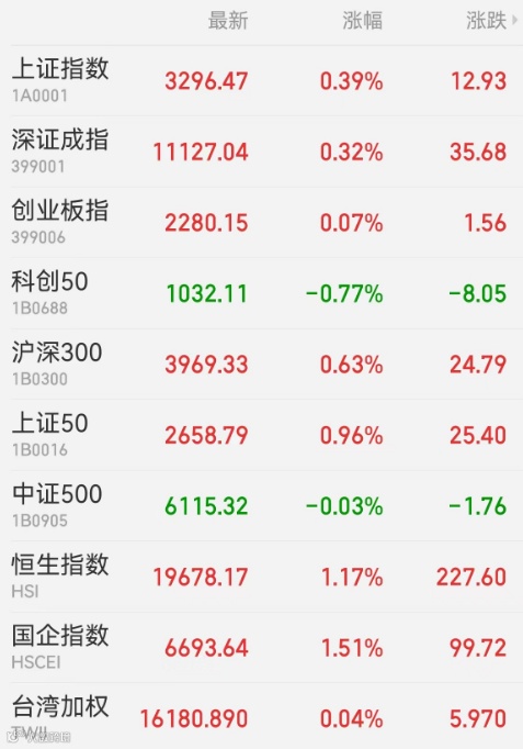1、A股:A股缩量震荡,机器人及部分AI核心股出现反抽,大消费全天强势,个股全天涨多跌少。截至收盘,上证指数涨0.39%报3296.47点,深证成指涨0.32%,创业板指涨0.07%,北证50涨1.18%,万得全A、万得双创涨跌不一。A股全天成交7973亿元,环比有所收窄;汇率企稳后外资恢复加仓势头,北向资金净买入41.32亿元,贵州茅台获净买入15.43亿元。