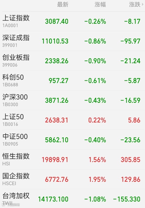 2、港股:香港恒生指数收涨1.56%报19898.91点,恒生科技指数涨2.14%,恒生国企指数涨1.95%。电力、新能源股爆发,多只龙头电力股涨超10%,中国电力涨近19%。大市成交1219.53亿港元,南向资金净买入20.53亿港元,腾讯控股获净买入11.58亿港元居首,中国海洋石油遭净卖出1.84亿港元最多。中国台湾加权指数收跌1.08%,报14173.10点。