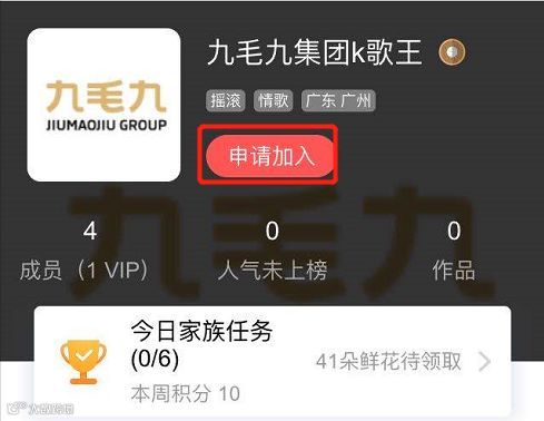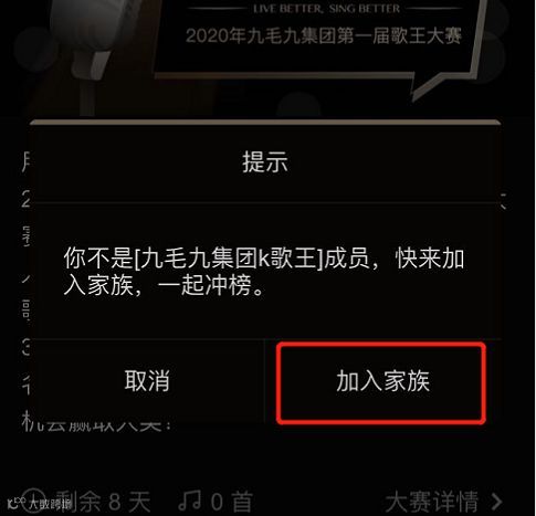 ②若未加入“九毛九集团k歌王”家族,需先加入家族,在弹框点击“加入家族”。