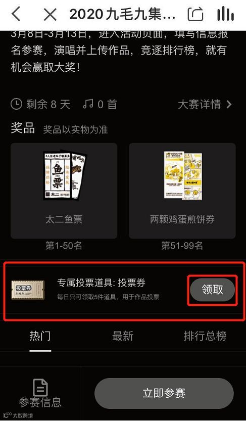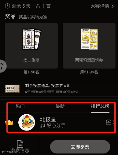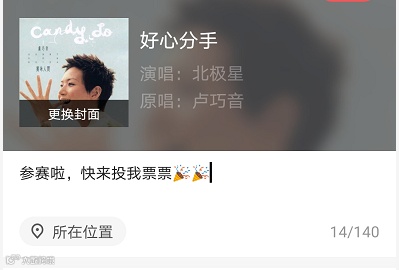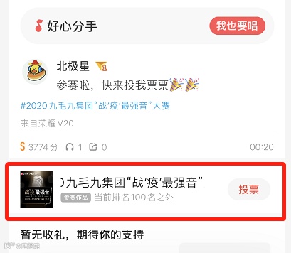 6、点击参赛后,直接搜索自己想唱的歌曲发布就好啦!接着就等着投票吧!
