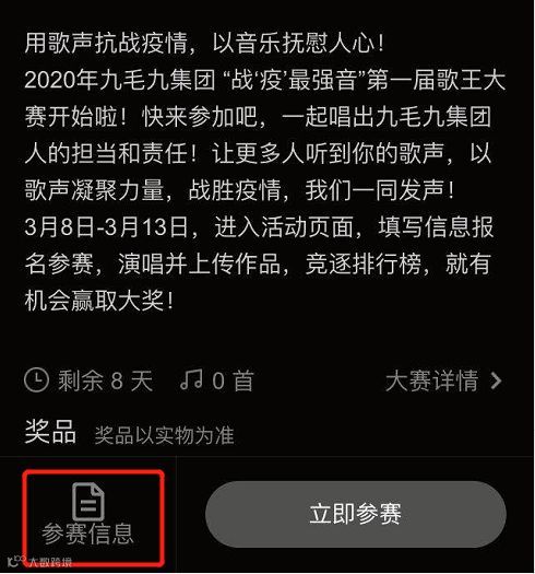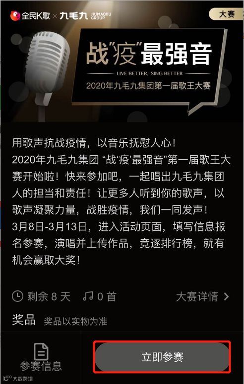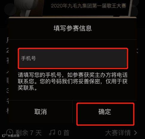 ①若已加入“九毛九集团k歌王”家族,在弹框填写正确的手机号码后点击“确定”,再点击参赛就可以了。(手机号码与日后奖品寄送息息相关哟~)