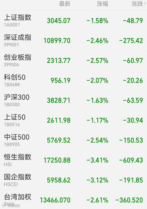 1、A股:沪深两市全天震荡下行,盘中反抽力度较弱,上证指数收盘跌1.58%报3045.07点,再创本轮调整新低;深证成指跌2.46%,创业板指跌2.57%,万得全A、万得双创分别跌2.25%、2.85%;两市全天成交6488亿元,仍维持在地量水平。两市超4300只个股下跌,锂矿、锂电池、光伏等新能源板块集体走低,燃气、热泵概念逆势活跃。兴业证券表示,近期市场连续波动调整,背后是海内外不确定性交织共振,导致风险偏好在短期内的急剧收缩。从多项指标来看,市场悲观预期已很大程度反映在股价中,调整已比较充分,市场已是底部区域。