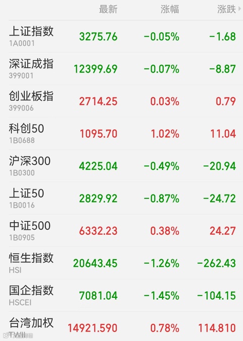 1、A股:沪深两市低开后全天仍维持窄幅震荡态势,稳增长与赛道短再度形成跷跷板效应,赛道股午后大涨而消费、基建等稳增长方向跌幅居前。个股整体涨多跌少,短线情绪得到很大程度修复。截至收盘,上证指数跌0.05%报3275.76点,深证成指跌0.07%,创业板指涨0.03%,科创50涨1.02%,万得全A、万得双创分别涨0.17%、0.85%。大市全天成交8689亿元,上日同期为8347亿元。