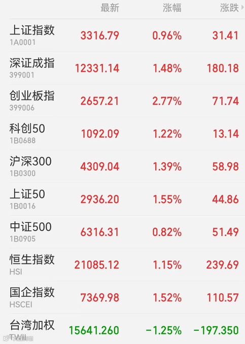 1、A股:沪深股指再次展现极强韧性,三大股指集体上扬,上证指数收盘涨0.96%报3316.79点,创业板指涨2.77%报2657.21点,深证成指涨1.48%报12331.14点;大市成交1.09万亿元。盘面上,锂电、风电领涨,宁德时代再涨近6%;特高压、光伏、白酒、铝金属、储能板块造好,金融、制药、汽车、疫苗板块午后发力。教育、文化传媒、互联网板块调整,房地产、煤炭板块逐渐企稳。