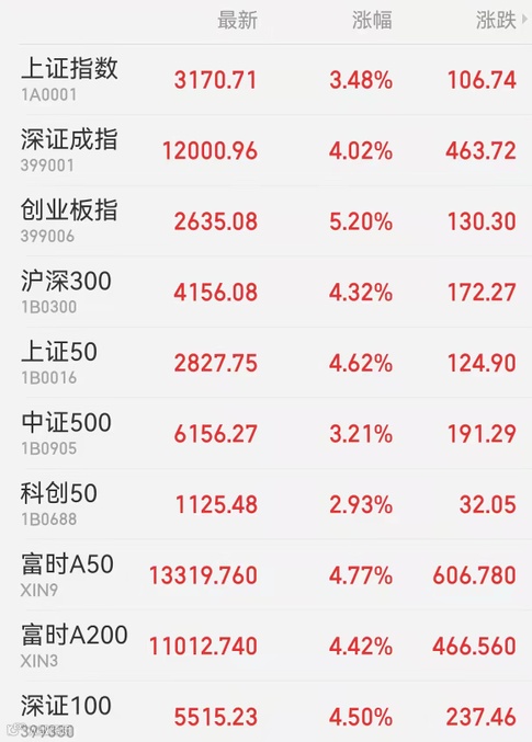 1、A股:A股全天呈现先抑后扬态势,午后金融委会议彻底激发多头信心,指数猛烈上攻,贵州茅台、宁德时代、招商银行、比亚迪、五粮液、隆基股份、亿纬锂能等获主力资金力捧。盘面上,金融股及时挺身而出,宁组合、茅指数均录升5%左右,航空、旅游股掀涨停潮,新冠检测板块则逆市下跌。截至收盘,上证指数涨3.48%报3170.71点,深证成指涨4.02%报12000.96点,创业板指涨5.20%报2635.08点,沪深300涨4.32%报4156.08点,万得全A涨3.77%;大市成交1.2万亿元。