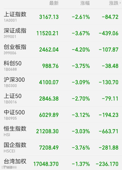 1、A股:沪深股指全线下滑,创业板指创出2020年7月以来新低,两市超4100股下跌。截至收盘,上证指数跌2.61%报3167.13点,创业板指跌4.2%报2462.04点,深证成指跌3.67%报11520.21点;大市成交0.96万亿元。盘面上,锂矿、稀土、白酒、光伏、半导体、金融板块带头调整,房地产板块20余股跌停;物流、预制菜板块大涨,种业股午后冲高。贵州茅台、宁德时代、比亚迪、五粮液等跌成一片,山西汾酒、海康威视、中国中免、恒瑞医药、上汽集团、长城汽车等明星股批量创下阶段新低。