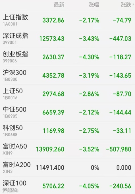 1、A股:A股三大指数单边下行,上证指数收跌2.17%报3372.86点,深证成指跌3.43%报12573.43点,创业板指跌4.3%报2630.37点,科创50跌2.75%报1169.98点,万得全A跌2.52%报5286.41点;市场成交额超万亿元。盘面上,航空、石化、白酒、旅游等板块跌幅明显,锂电池、元宇宙、半导体、新能源车等题材深度回调。三胎概念逆市爆发,数十只个股涨停。年初至今,上证指数累计跌超7%,深证成指跌超15%,创业板指跌超20%,科创50跌超16%。