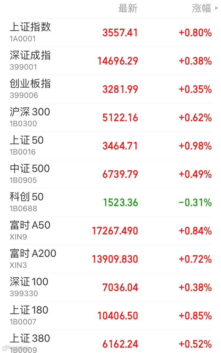1、A股:周二,上证指数报3557.41点,上涨0.8%,成交额4370.92亿。深证成指报14696.29点,上涨0.38%,成交额5743.04亿。创业板指报3281.99点,上涨0.35%,成交额2399.31亿。两市合计成交10113.96亿,两市成交额连续三个交易日突破万亿。盘面上,农业种植、中船系、交运设备等涨幅居前。