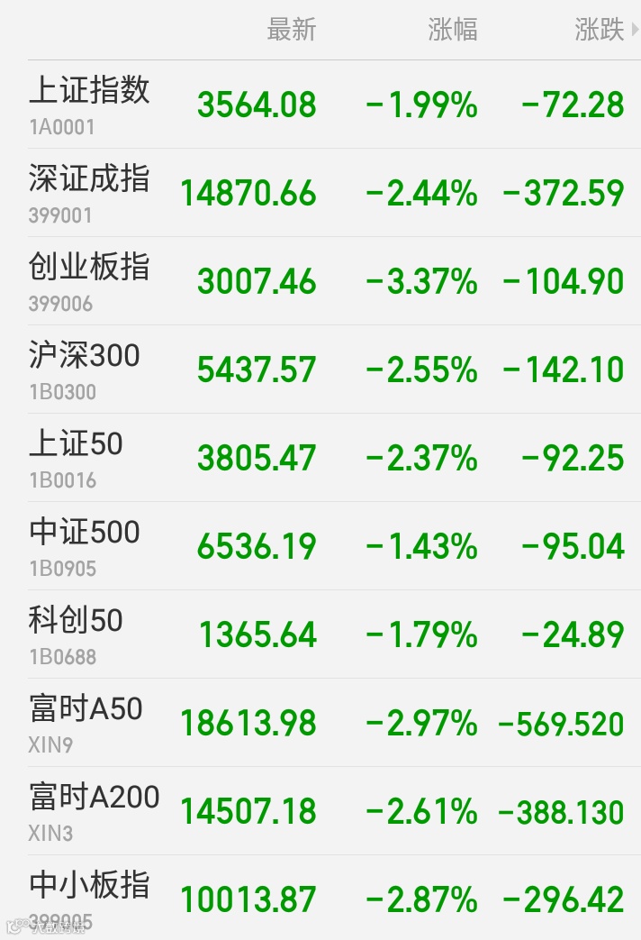 1、A股:上证指数报3564.08点,下跌1.99%,成交额4844.30亿。深证成指报14870.66点,下跌2.44%,成交额5794.71亿。创业板指报3007.46点,下跌3.37%,成交额1871.48亿。两市合计成交10639.02亿。盘面上,半导体、酒店、数字货币等板块涨幅居前,白酒、草甘膦、超级品牌等板块跌幅居前。