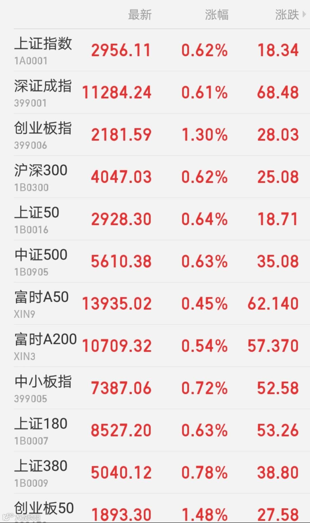 1、A股:A股震荡攀升,互联网营销和大消费板块花开两朵。上证指数收涨0.62%报2956.11点,连升三日;深证成指涨0.61%报11284.24点;创业板指涨1.3%报2181.59点,较3月低点已涨逾20%,进入技术性牛市;万得全A涨0.62%;两市成交额超6200亿元。