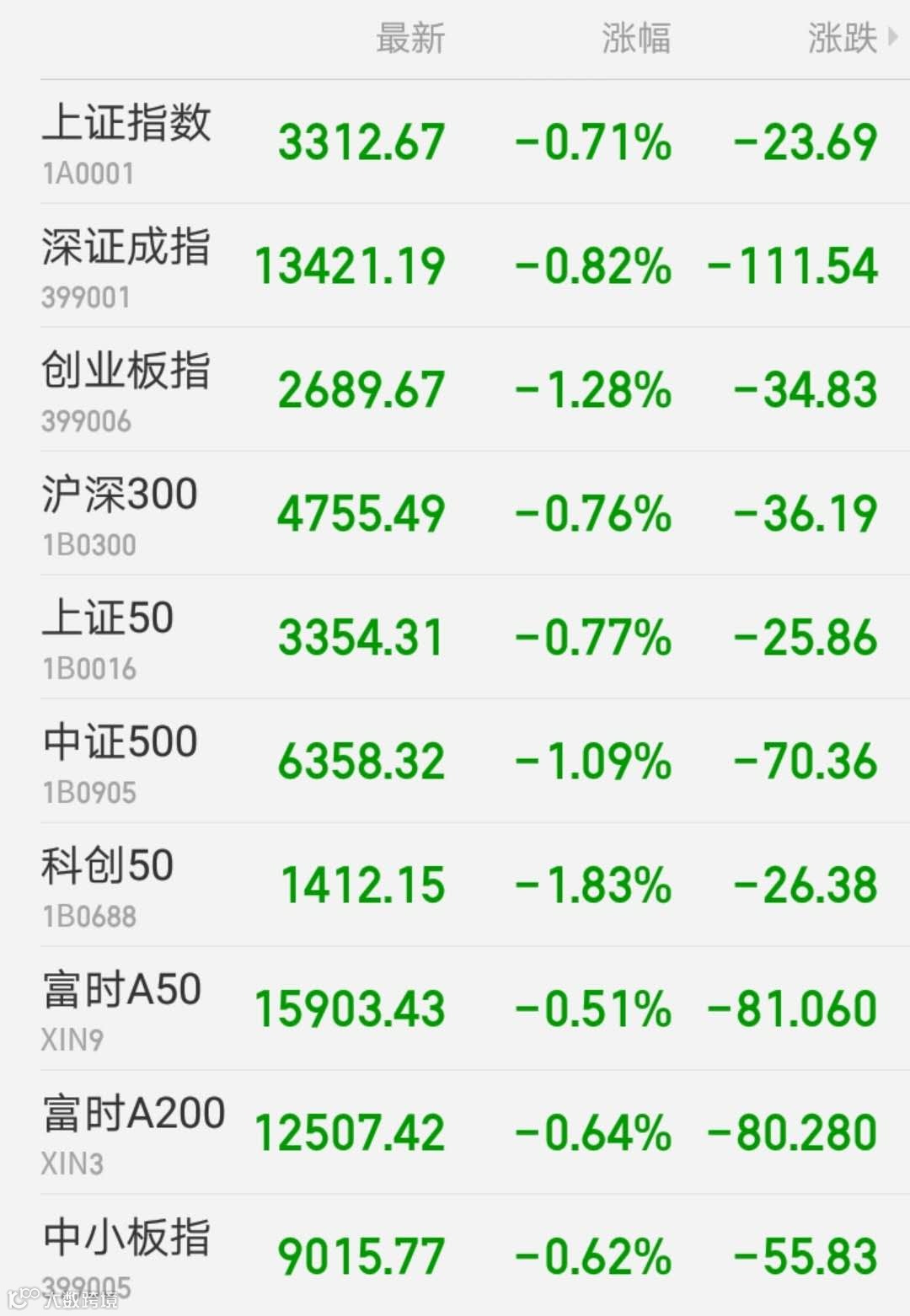 1、A股:A股高开低走,光伏、医药、食品板块领跌大市;量子技术指数收涨3.6%。上证指数收报3312.67点,跌0.71%;创业板指跌1.28%,创业板综指跌0.76%,深证成指跌0.82%,科创50跌1.83%;万得全A跌0.73%,成交7285亿元。北向资金净卖出32.43亿元,为连续4日净卖出,白酒龙头遭外资减仓,五粮液和贵州茅台分别遭净卖出4.02亿元和3.46亿元,通威股份逆势获净买入4.11亿元。