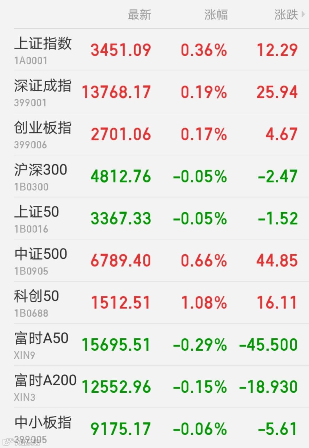 1、A股:沪深两市窄幅震荡,三大股指最终全部收红。上证指数收报3451.09点,上涨0.36%;深证成指收报13768.17点,上涨0.19%;科创50收涨1.08%;创业板指收涨0.17%;万得全A收报5371.51点,上涨0.34%,成交1.07万亿元。北向资金净卖出20.38亿元,兴业银行遭净卖出5.83亿元居首,中国卫星获净买入5.4亿元最多。