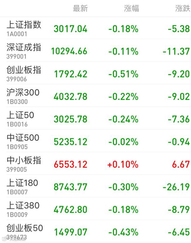 1、A股:A股震荡回调,上证指数收跌0.18%报3017.04点,结束三连阳;深证成指跌0.11%报10294.66点;创业板指跌0.51%报1792.42点;万得全A跌0.08%。两市成交6680亿元,较上日缩量明显。北向资金净流入44.82亿元,连续25日净流入。