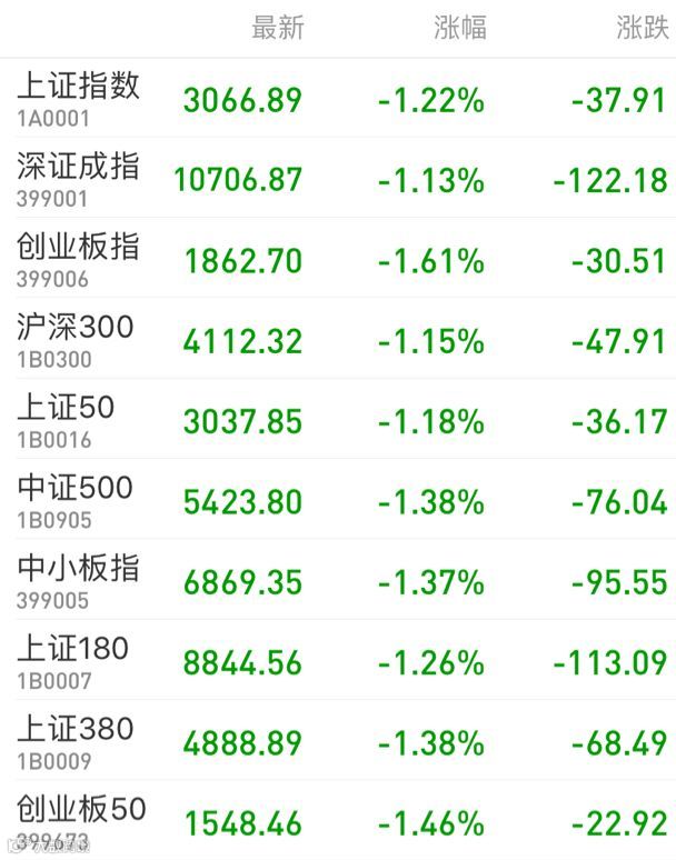 1、A股:A股弱势下探,权重股集体低迷,黄金板块获避险资金流入。上证指数收盘跌1.22%报3066.89点;深证成指跌1.13%报10706.87点;创业板指跌1.61%报1862.70点;万得全A跌1.23%报4388.26点。两市成交近7800亿元。