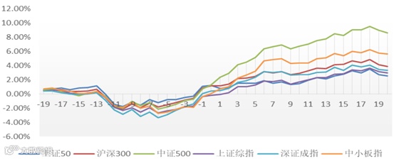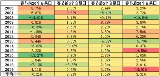 从2006年至2019年上证50、沪深300、中证500、上证综指、深证成指和中小板指数在春节前后20个交易日累加收益率来看,这些指数在春节前20个交易日到春节前5个交易日的时间区间中均为震荡下行的状态。而在春节前5个交易日到春节后18个交易日的区间内为上涨状态。在上述指数当中,中证500指数的涨幅最高,春节后18个交易日的累加收益率约为8%。