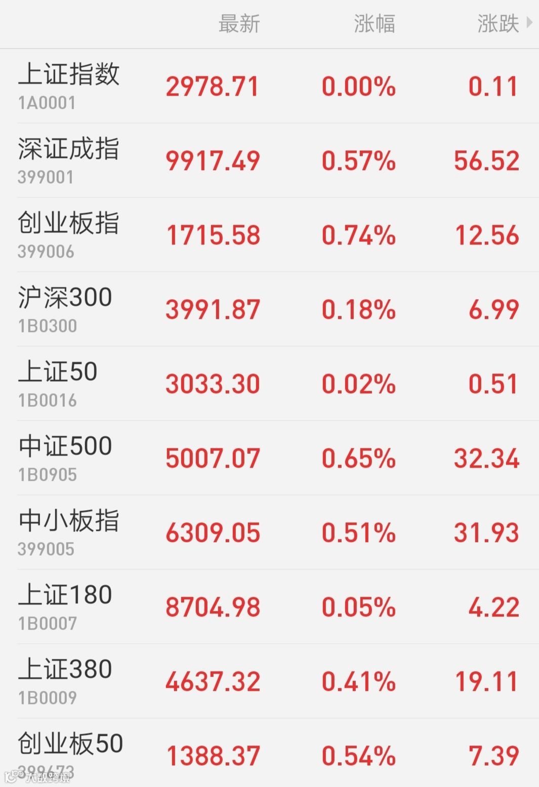 1、A股:上证指数收盘涨0.11点,报2978.71点;深证成指涨0.57%报9917.49点;创业板指涨0.74%报1715.58点。两市成交额不足4000亿,创阶段新低。