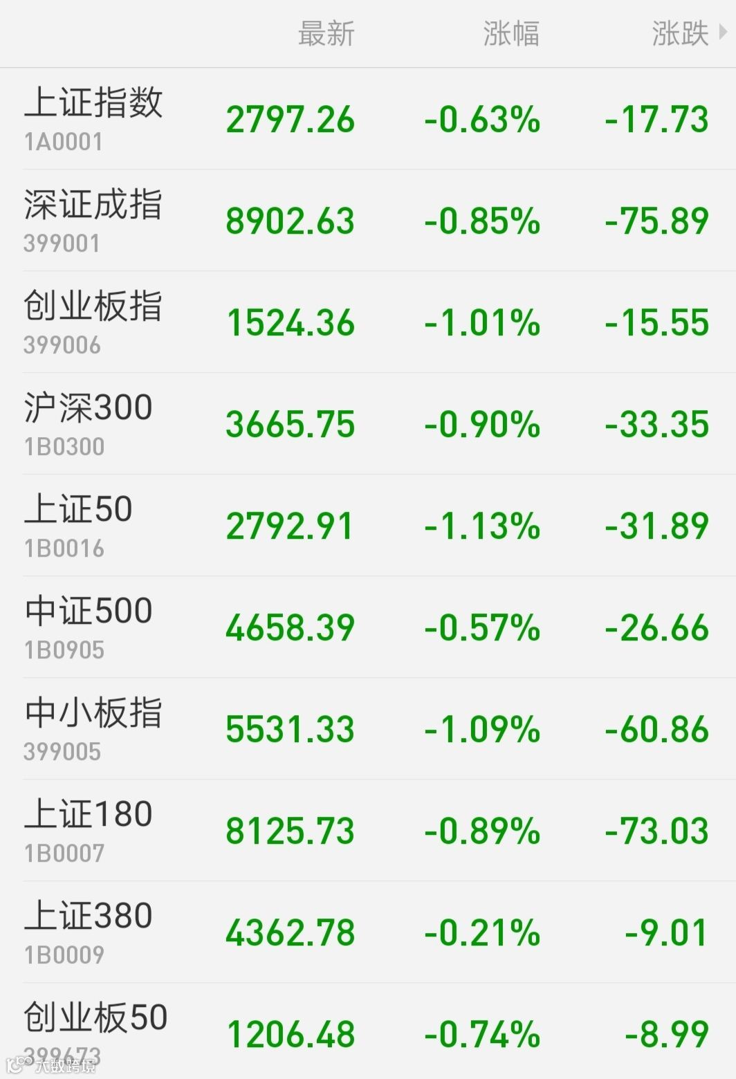1、A股:A股低开后弱势整理,上证指数收盘跌0.63%报2797.26点;深证成指跌0.85%;创业板指跌1.01%。两市成交额3396亿元,较上日略有缩减。北向资金净流出超24亿元。科创板个股呈现前低后高态势,福光股份涨逾15%领涨;昨日上市大涨的微芯生物跌逾10%。