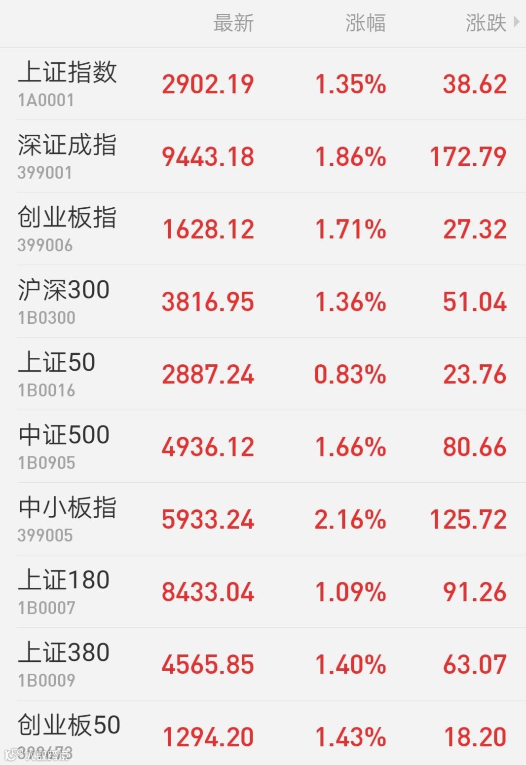 1、A股:上证指数收盘涨1.35%站上2900点,创业板指涨1.71%。申万一级行业全线飘红,农业板块保持强势,