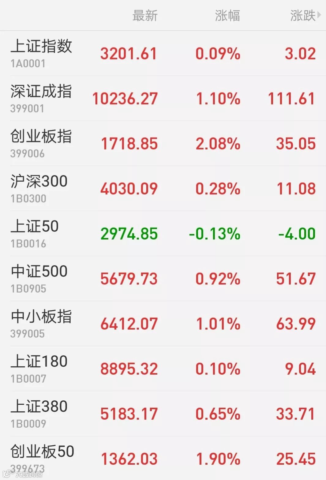 1、A股:A股V型反弹,创业板表现明显强势,蓝筹股整体表现较弱。上证综指收盘涨0.09%报3201.61点,一度跌1.3%;深成指涨1.1%;创业板指涨2.08%;万得全A涨0.64%。两市成交6523亿元,创两个月新低。行业板块方面,燃料电池概念卷土重来,逾10股涨停;猪肉概念股强势不减;环保板块发力,科融环境等多股涨停;5G概念活跃,春兴精工等涨停;OLED概念午后崛起,深天马A等涨停;软件股午后走强,浪潮信息涨停;家电、地产、白酒、金融等板块表现低迷;创投概念股遭杀跌;近端次新股大幅回调。乐视网连续三日跌停。