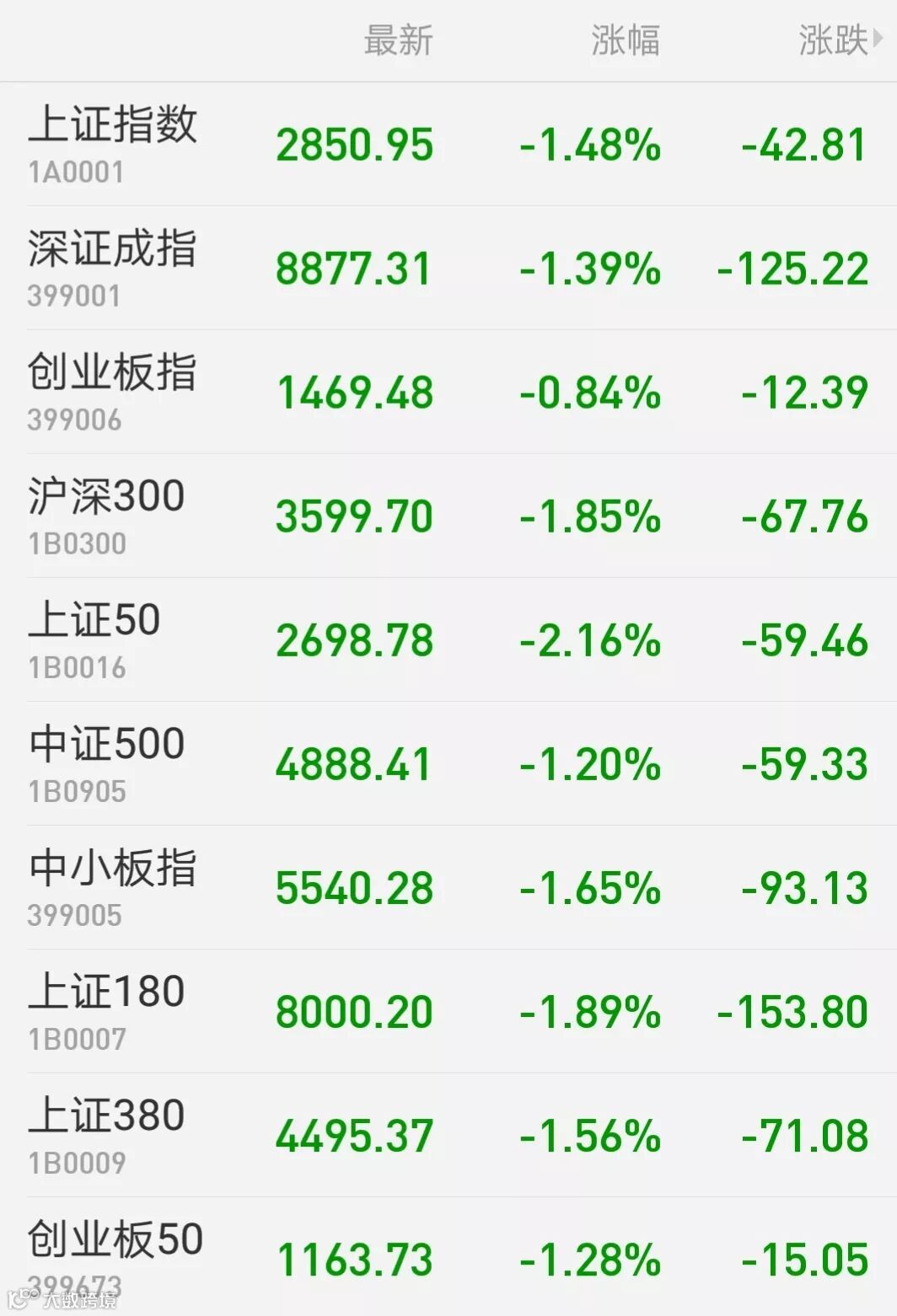 1、A股:震荡下探,上证综指收盘跌1.48%,报2850.95点,创近2个半月新低;深证成指跌1.39%;创业板指跌0.84%;万得全A跌1.42%。两市成交4340亿元,续创近三个月新低。