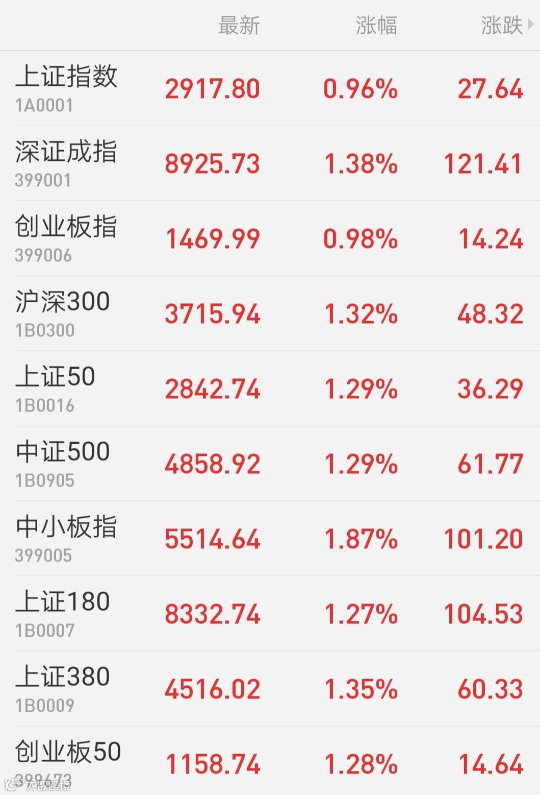 1、A股:A股大幅高开后略微走低,上证综指收盘涨近0.96%重返2900点;深证成指涨1.38%;创业板指涨0.98%;万得全A涨1.42%。两市成交额突破5000亿元,创一周新高。行业板块方面,知识产权受追捧,中文在线等多股涨停。午后垃圾分类走强,龙马环卫等近10股涨停。国产芯片大涨,韦尔股份等多股涨停。券商前高后低,华林证券涨停。区块链概念抢眼,奥马电器等多股涨停。网游概念走势强劲,电魂网络6连板。青蒿素依旧活跃,昆药集团、润都股份三连板。燃料电池冲高回落,中钢天源、龙蟠科技涨停。港股照港裕廊上市暴涨逾200%,A股日照港涨停,其余港口股亦有拉升。