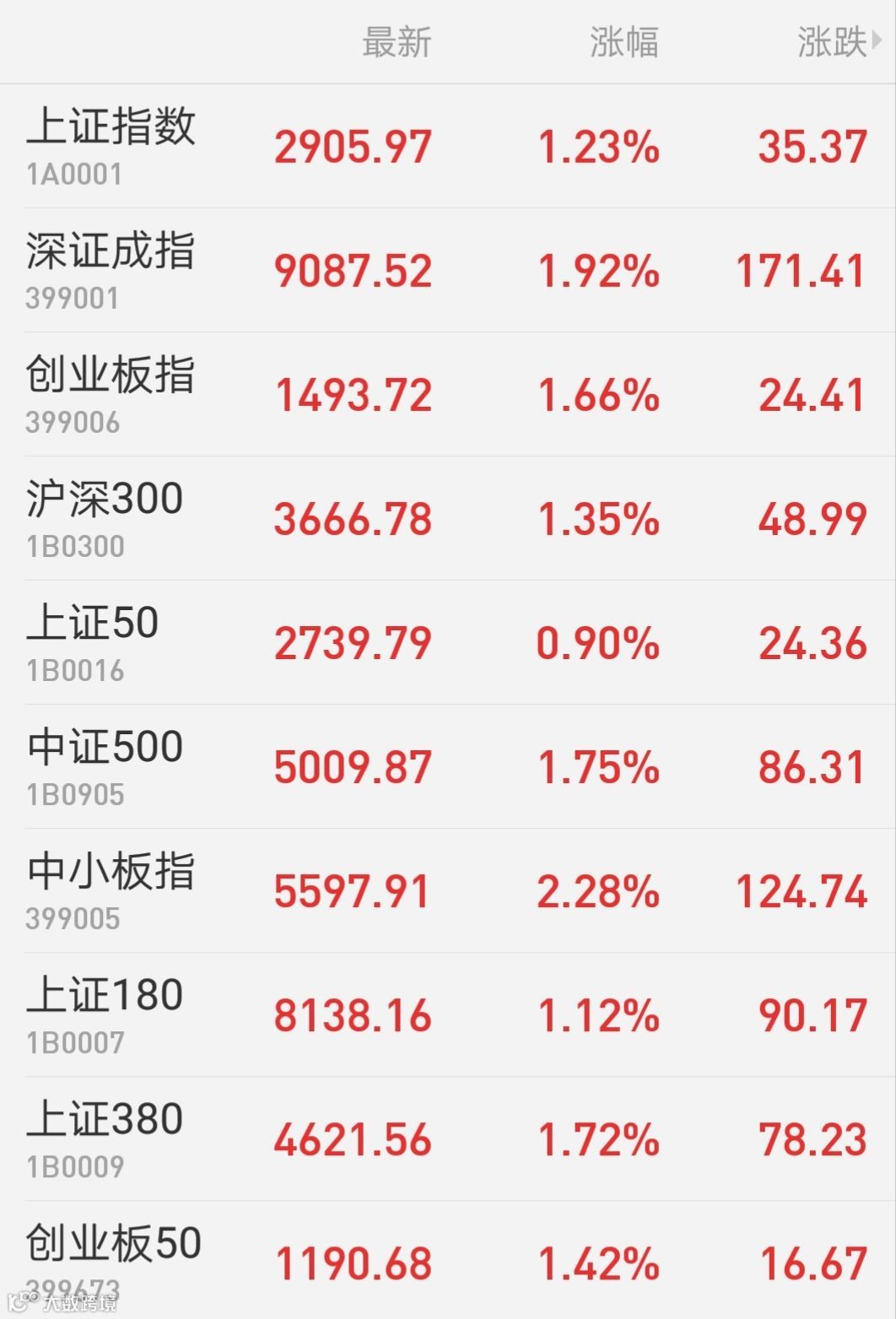 1、A股:A股单边上行,题材股全面回暖。上证综指收盘涨1.23%收复2900点;深证成指涨1.92%收复9000点;创业板指涨1.66%;万得全A涨1.56%。两市成交额接近4800亿元,较上日略有放大。稀土板块延续强势,个股再掀涨停潮,盛和资源等近20股涨停。5G概念股大涨,东方通信二连板,东信和平涨停。长三角一体化概念表现活跃,华贸物流涨停。水利板块午后异动,安徽水利封板。工业大麻尾盘走高,仁和药业、莱茵生物涨停。