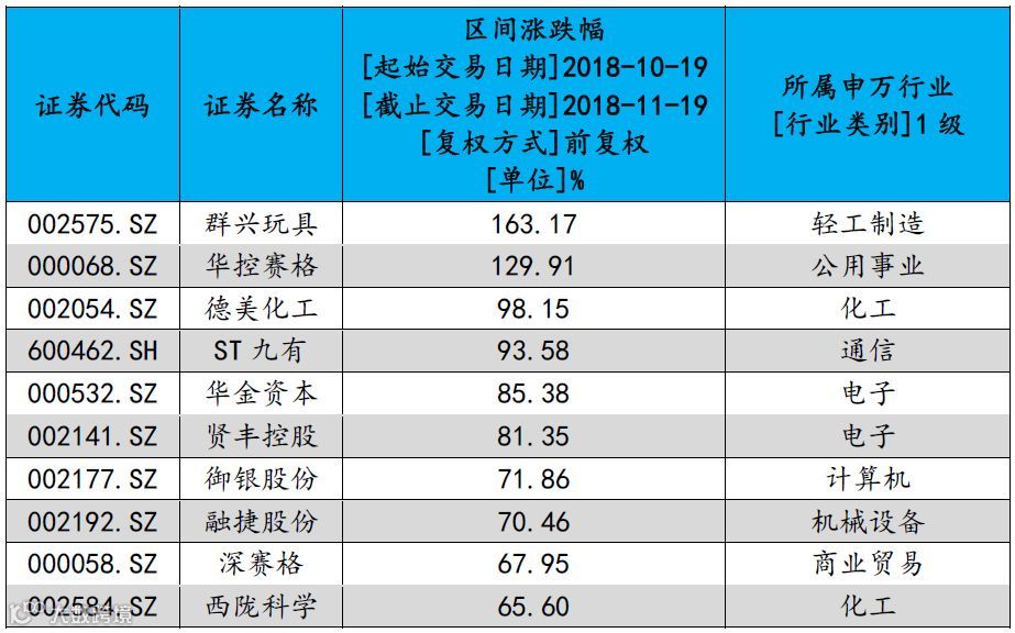 表4:2018.10.19-2018.11.19粤港澳大湾区涨幅前十名个股(剔除刚上市新股)