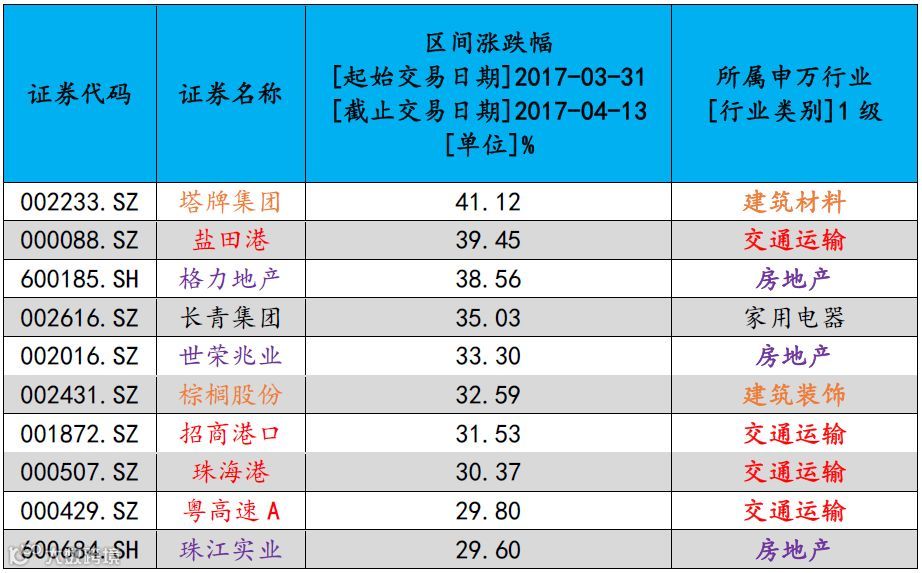 表1:2017.3.31-2017.4.13粤港澳大湾区涨幅前十名个股(剔除刚上市新股)