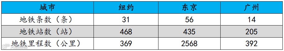 以地铁为例,由于旧金山湾区面积过小,我们暂不统计,选取纽约大湾区、东京大湾区、粤港澳大湾区中的代表城市纽约、东京、广州进行对比,目前纽约的地铁线路有31条,468座车站,总长369公里,东京的地铁线路有56条,435座车站,总长2568公里,广州的地铁线路有14条,205座车站,总长392公里。