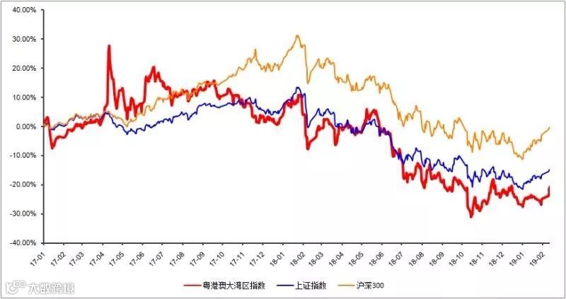 图1:2017年1月-2019年2月粤港澳大湾区指数与上证指数、沪深300指数对比