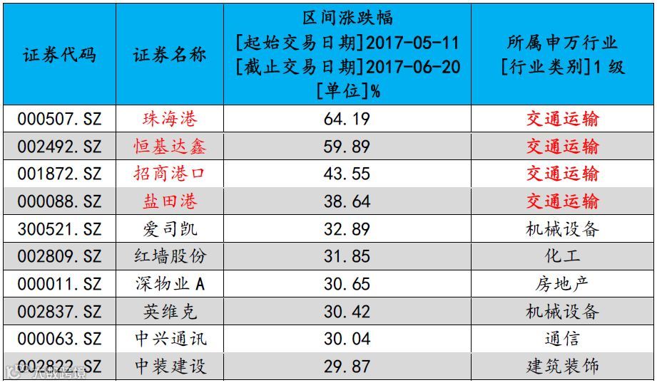 表2:2017.5.11-2017.6.20粤港澳大湾区涨幅前十名个股(剔除刚上市新股)