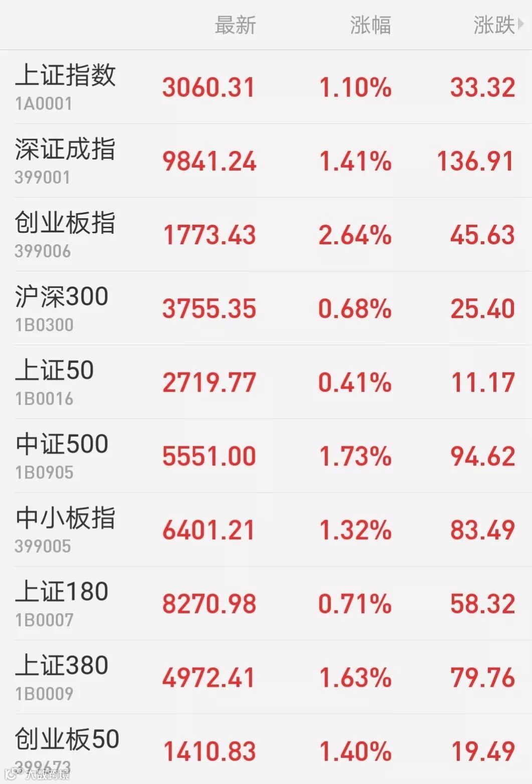 1、A股:沪深两市振幅加大,上证综指收涨1.1%报3060.31点,深证成指涨1.41%报9841.24点,创业板指涨2.64%报1773.43点,两市再度放量成交1.14万亿。北上资金结束连续4日净流出。