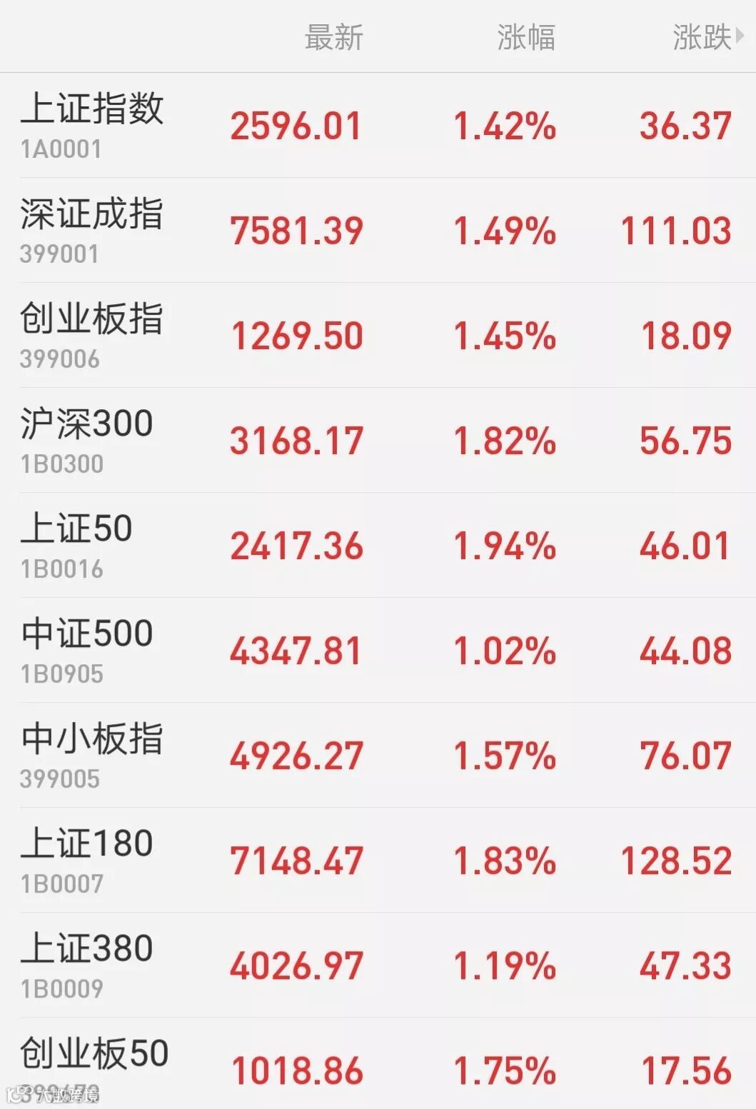 1、A股:上证指数报2596.01点,上涨1.42%,成交额1512.70亿。深证成指报7581.39点,上涨1.49%,成交额1753.81亿。创业板指报1269.50点,上涨1.45%,成交额478.48亿。两市合计成交3266.51亿。从盘面上看,工艺商品、钢铁行业等板块涨幅居前。