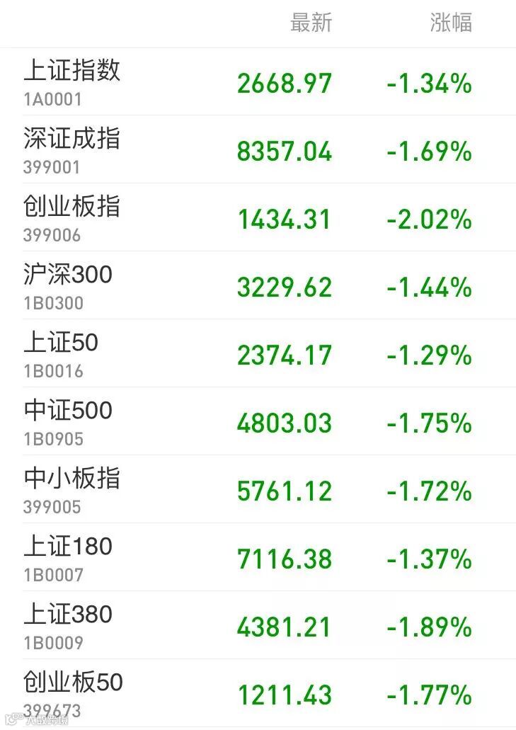 1、A股:上证指数报2668.97点,下跌1.34%,成交额1154.99亿。深证成指报8357.04点,下跌1.69%,成交额1500.08亿。创业板指报1434.31点,下跌2.02%,成交额464.47亿。两市合计成交2655.07亿。从盘面看,仅煤炭采选板块上涨。