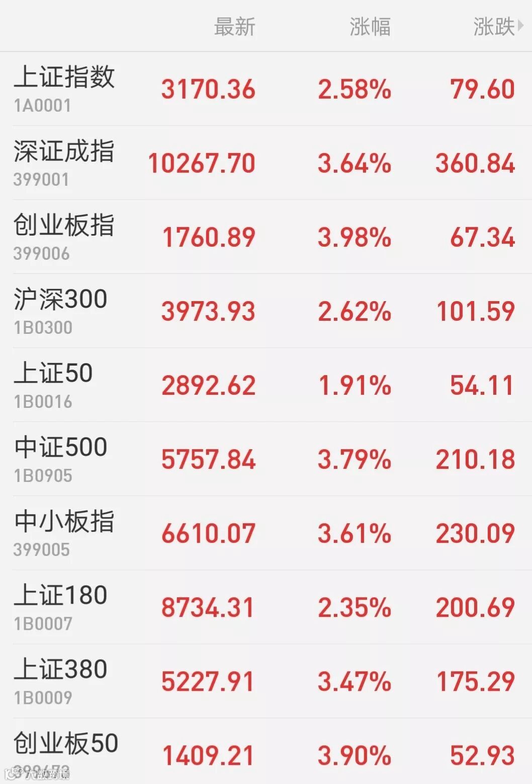 1、A股:A股4月开门红,上证综指放量收涨2.58%,剑指3200点并刷新近一年新高,报3170.36点;深证成指涨3.64%重回万点大关;创业板指涨4%;万得全A涨3.16%。两市成交额时隔半个多月以来再度突破万亿。