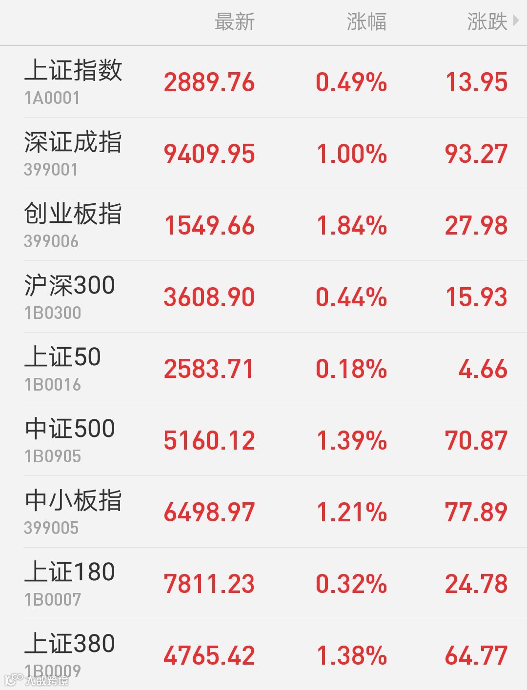 1、A股:上证指数报2889.76点,上涨0.49%,成交额1271.61亿;深证成指报9409.95点,上涨1%,成交额1721.46亿;创业板指报1549.66点,上涨1.84%,成交额624.91亿;两市合计成交2993.07亿。从盘面看,高送转、锂电池等板块涨幅居前。