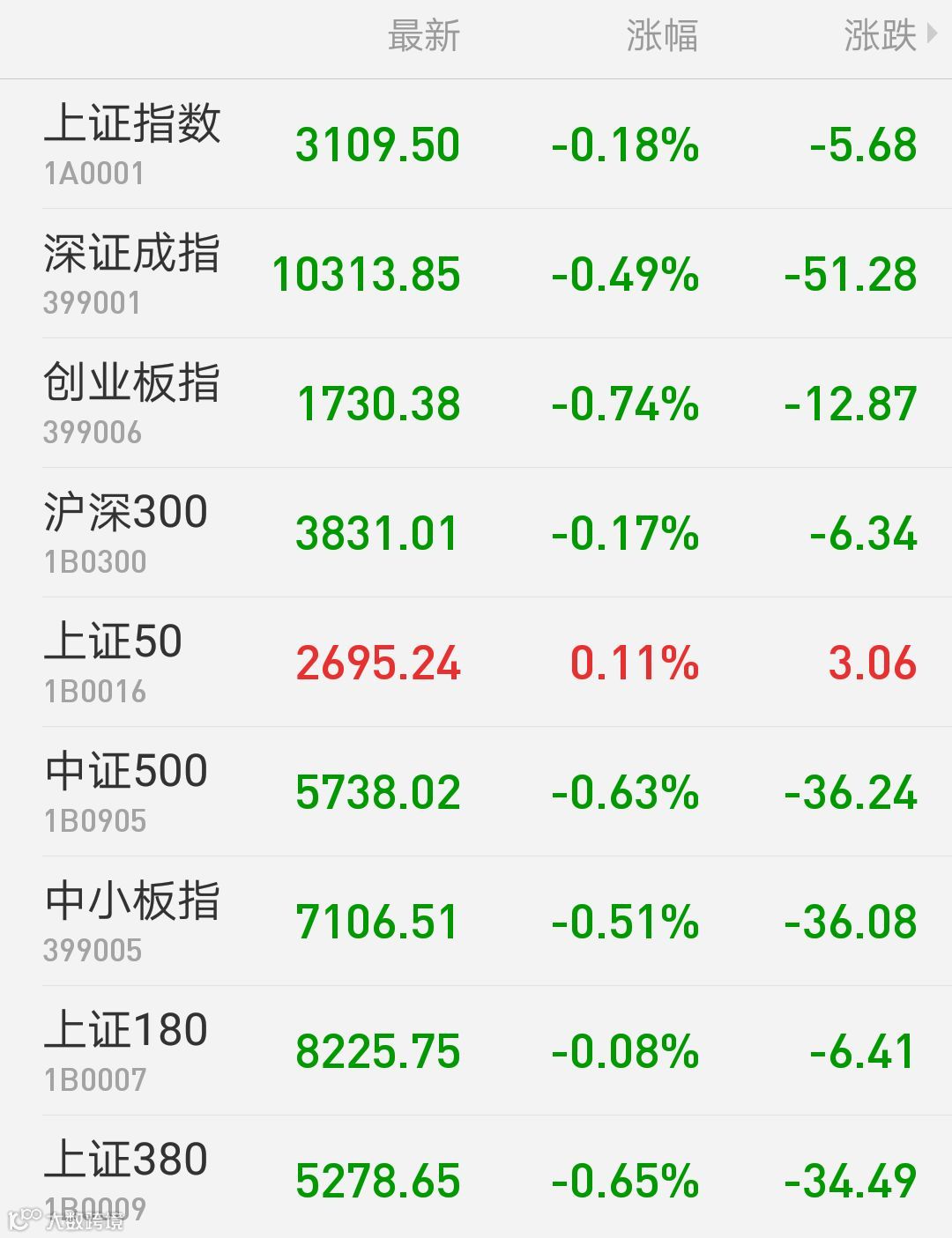 1、A股:上证指数报3109.50点,下跌0.18%,成交额1671.74亿。深证成指报10313.85点,下跌0.49%,成交额1929.45亿。创业板指报1730.38点,下跌0.74%,成交额641.06亿。两市合计成交3601.19亿。从盘面看,海南、钢铁等板块涨幅居前。