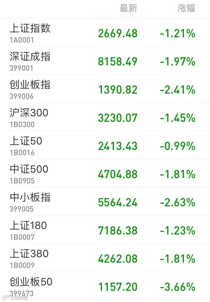 1、A股:上证指数报2669.48点,下跌1.21%,成交额1028.61亿。深证成指报8158.49点,下跌1.97%,成交额1449.74亿。创业板指报1390.82点,下跌2.41%,创4年新低,成交额458.35亿。两市合计成交2478.35亿。从盘面看,仅有工艺商品、公用事业板块实现上涨。