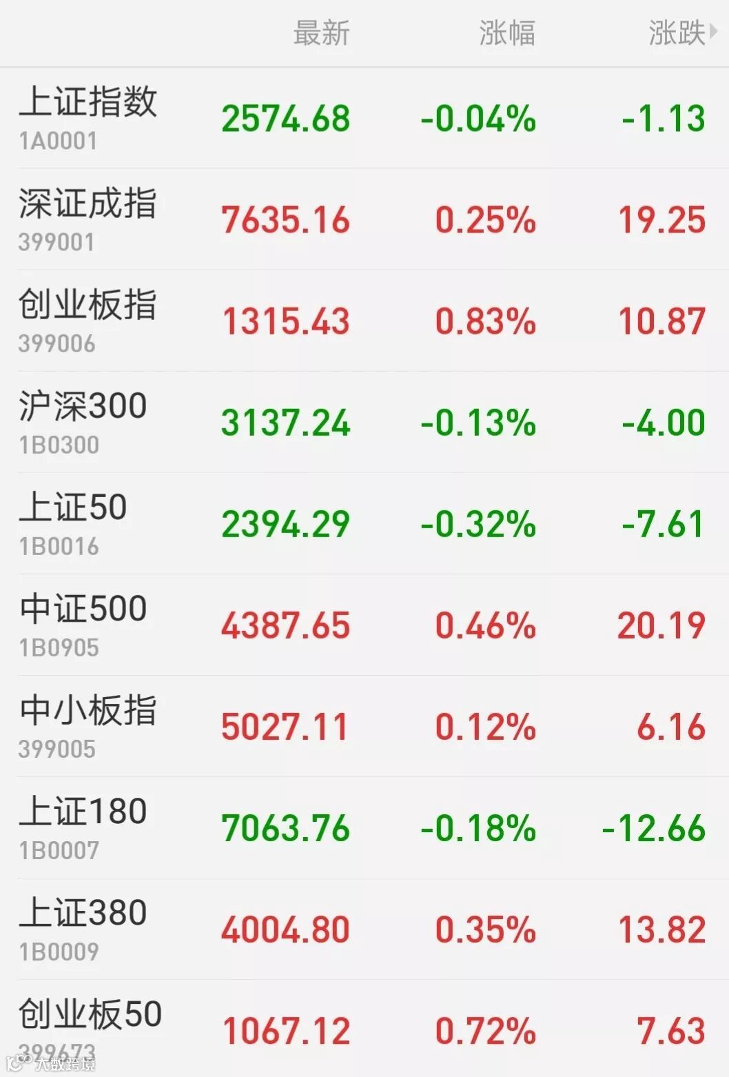 1、A股:上证综指翻红未果,收跌0.04%报2574.68点,连跌4日;深证成指涨0.25%报1315.43点,创业板指涨0.83%报1315.43点,万得全A涨0.24%。两市成交2500亿元。板块方面,5G板块表现不俗,军工股在震荡走势下相对稳健;部分超跌的传媒股继续上扬,新华传媒近9日7板;权重股多数低迷,地产、民航跌幅居前,白酒、银行股也大多飘绿;此前有过一定涨势的部分题材回调,福建、上海板块以及维生素概念均有不同程度回撤。