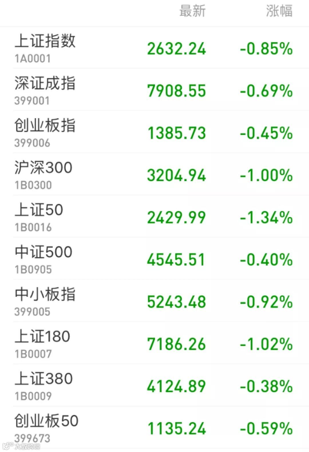 1、A股:权重低迷拖累指数,上证综指收跌0.85%报2632.24点,深证成指跌0.69%报7908.55点,创业板指跌0.45%报1385.73点,万得全A收跌0.58%。两市全天成交逾4100亿元。盘面上看,创投概念继续大涨,民丰特纸、市北高新双双喜迎8连板;次新股显现启动行情,环保股尾盘走强;国际油价急挫7%落入熊市,石油板块大幅走低;白酒股持续低迷,大金融板块同样表现欠佳;而近期热门个股大多止步连板势头,但*ST长生则全天剧烈震荡10%,最终仍封涨停录得5连板。