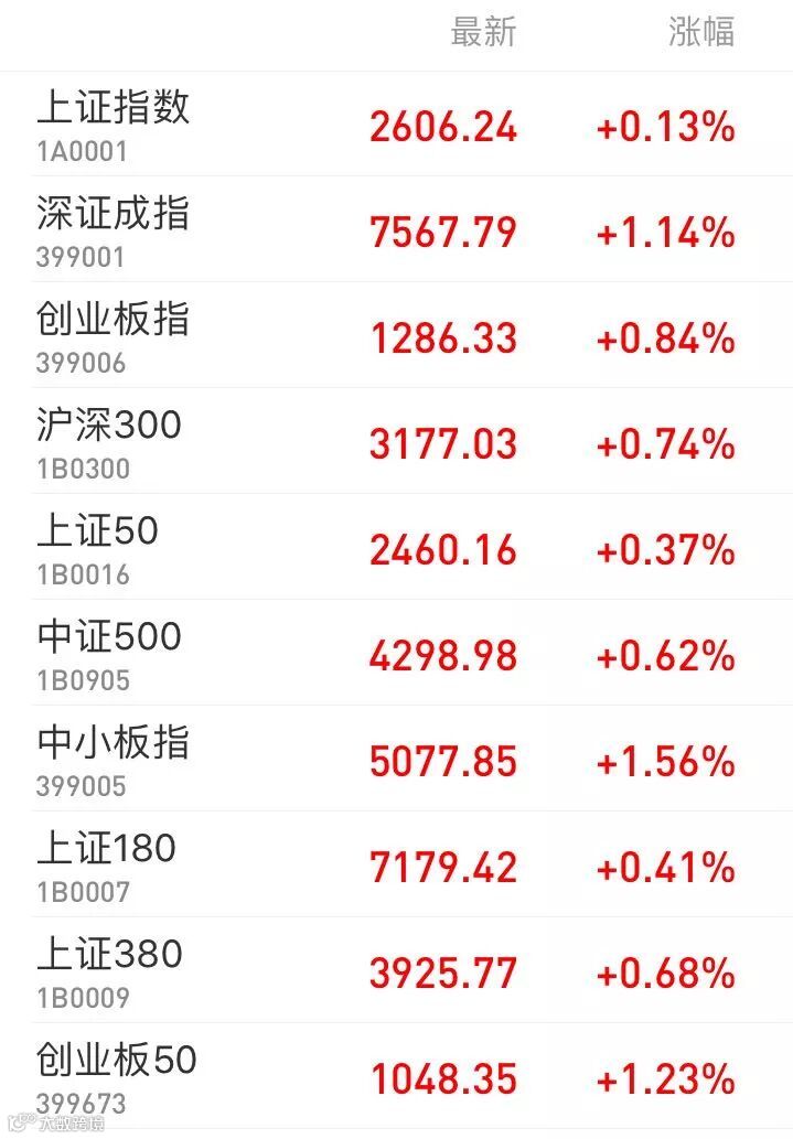 1、A股:上证综指收涨0.13%报2606.24点,连涨三日;深证成指涨1.14%报7567.79点;创业板指涨0.84%报1286.33点,一度涨近3%。万得全A收涨0.61%。两市成交3832亿元,上日成交约3100亿元。北上资金大幅净流入近87亿元,创深股通开通以来新高。人工智能板块全线大涨,