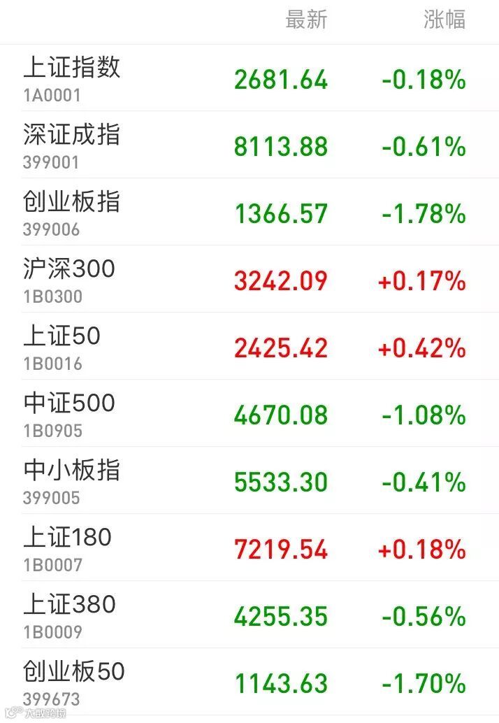 1、A股:上证指数报2681.64点,下跌0.18%,成交额1049.92亿。深证成指报8113.88点,下跌0.61%,成交额1457.71亿。创业板指报1366.57点,下跌1.78%,再创年内新低,成交额477.34亿。两市合计成交2507.64亿。从盘面看,酿酒行业、港口水运等板块涨幅居前。