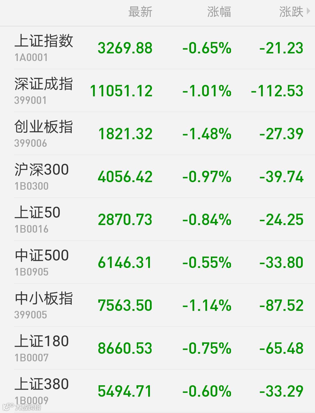 1、A股:上证指数报3269.88点,下跌0.65%,成交额1677.62亿。深证成指报11051.12点,下跌1.01%,成交额2283.85亿。创业板指报1821.32点,下跌1.48%,成交额704.58亿。两市合计成交3961.47亿。从盘面上看,新零售、独角兽等板块涨幅居前。