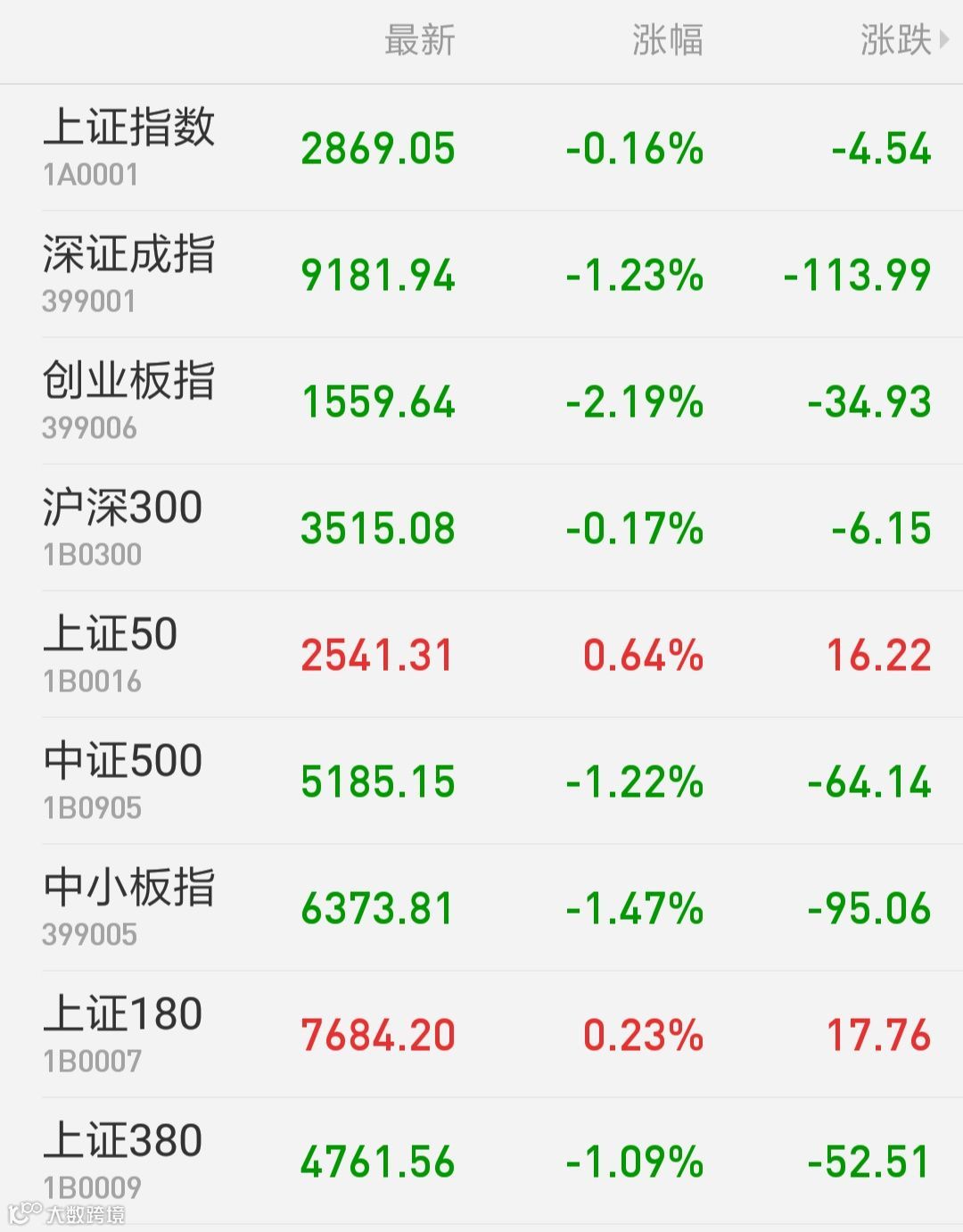 1、A股:上证指数报2869.05点,下跌0.16%,成交额1459.89亿。深证成指报9181.94点,下跌1.23%,成交额1807.00亿。创业板指报1559.64点,下跌2.19%,成交额566.67亿。两市合计成交3266.88亿。从盘面上看,近40只个股跌幅超9%,交运设备、船舶制造等板块涨幅居前。