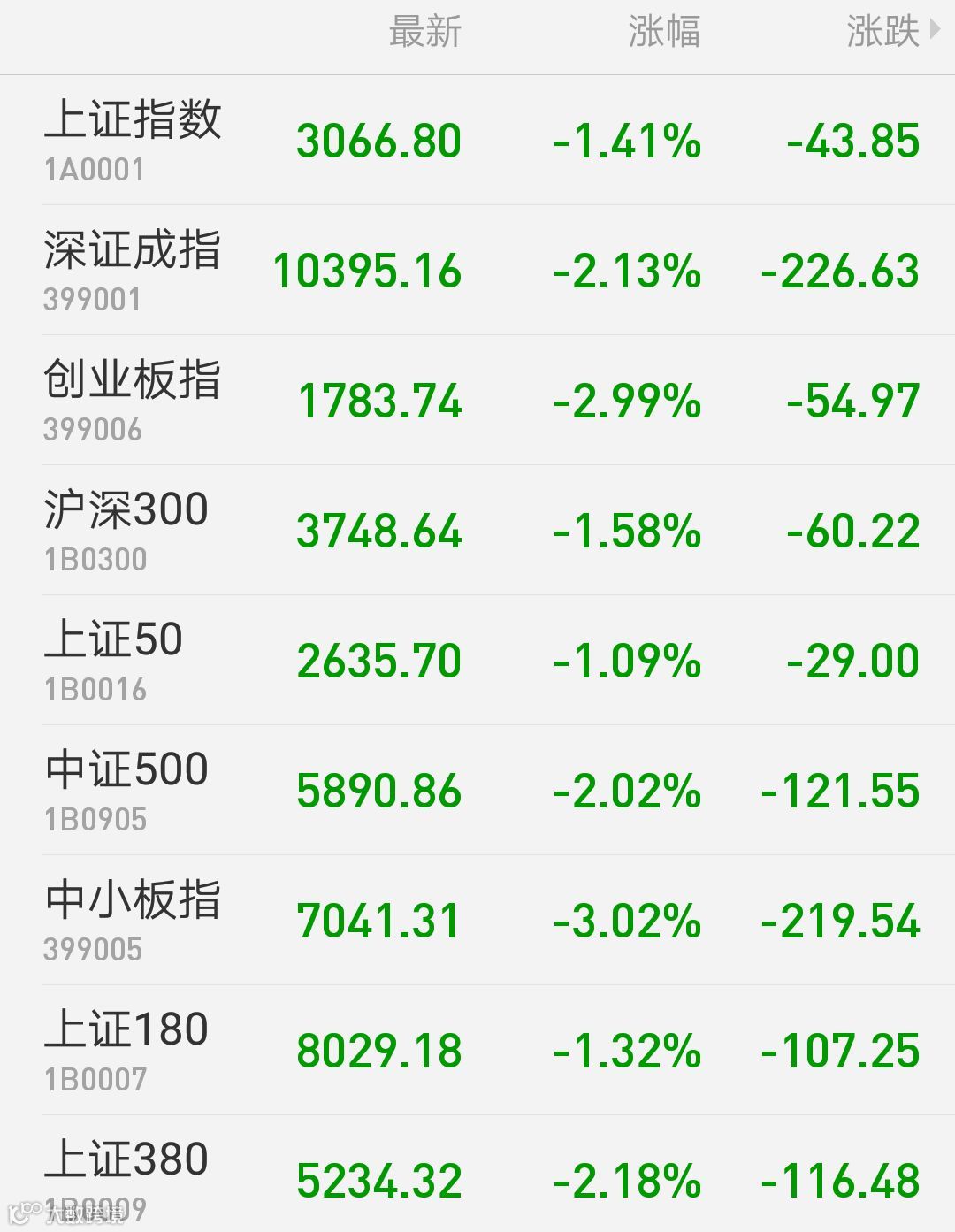 1、A股:上证指数报3066.80点,下跌1.41%,成交额1854.28亿,日K线四连阴,逼近年内低点。深证成指报10395.16点,下跌2.13%,成交额2809.32亿。创业板指报1783.74点,下跌2.99%,成交额983亿。两市合计成交4663.60亿。从盘面上看,两市仅贵金属板块上涨。
